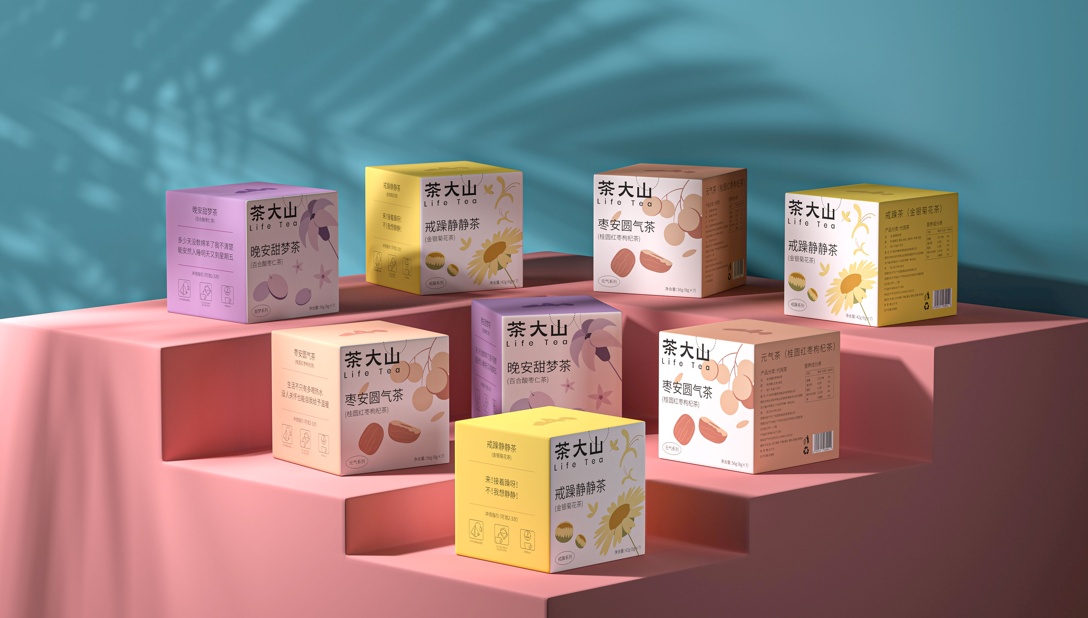 商品即信息,包裝即媒體。在設(shè)計(jì)“戒躁靜靜茶”、“棗安圓氣茶”、“晚安甜夢茶”3款養(yǎng)生茶包裝時(shí),我們從養(yǎng)生茶的原材料出發(fā),通過將金銀花、菊花、紅棗、桂圓、百合等核心原料進(jìn)行插畫演繹,從每款的核心原料中提取色彩用以區(qū)分3款不同包裝。整體包裝風(fēng)格亮麗清新、隨性自然,主體物突出。全新設(shè)計(jì)的產(chǎn)品包裝,讓茶大山在電商平臺上獲得了醒目的視覺優(yōu)勢,展現(xiàn)出獨(dú)特的品牌氣質(zhì)。
